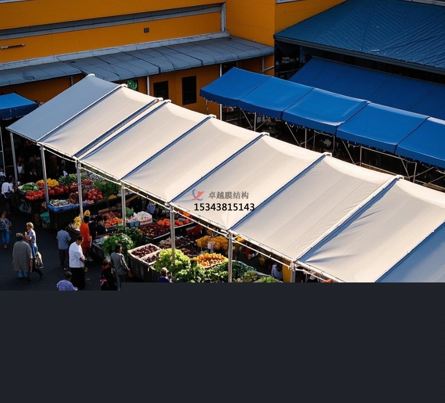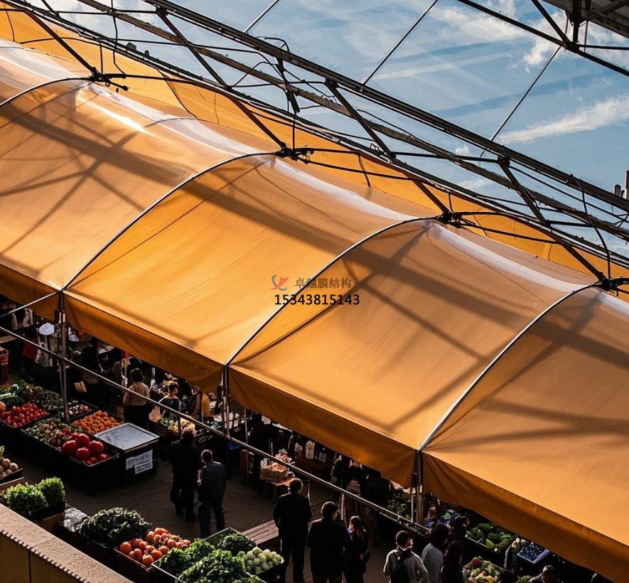 在城市的煙火氣味中,農(nóng)貿(mào)商場是不可或缺的存在,它承載著新鮮食材的匯聚與居民日常生活的快捷。但是,傳統(tǒng)農(nóng)貿(mào)商場頂棚在長期運用中暴露出許多問題,如年久失修易漏雨、空間布局局促、外觀陳腐等。膜結(jié)構(gòu)頂棚的出現(xiàn),宛如一陣清風,為農(nóng)貿(mào)商場帶來了全新的生機與革新。
