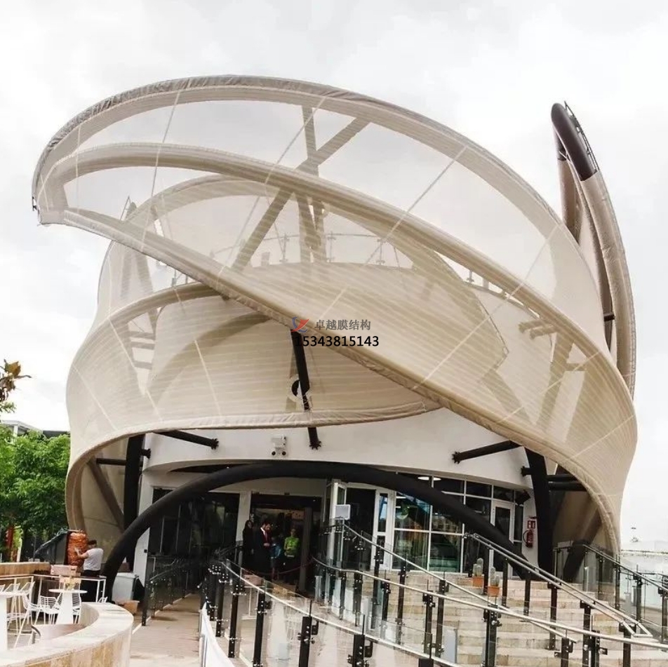 膜材是在聚酯纖維編織成的基布上涂敷PVC(聚氯乙烯)樹(shù)脂而形成的復(fù)合材料,非常的具有技術(shù)含量,其曲面可以隨著建筑師的設(shè)計(jì)需要任意變化,結(jié)合整體環(huán)境,建造出標(biāo)志性的形象工程。