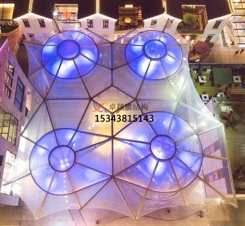 工程特點:該項目是國內好的單層ETFE加雙層氣枕膜完美嵌合的景觀雨棚建筑,利用ETFE膜材的高透光高自潔性以及雙層氣枕的隔熱能力,雨棚在具有遮陽擋雨功能的同時還可以實現(xiàn)自然采光,行人沒有傳統(tǒng)密封建筑的束縛感;另一方面,ETFE膜結構建筑是當代更新的建筑應用形式之一,工程高度定制,顏值高,具有好的性,天生自帶聚集人氣光環(huán)。