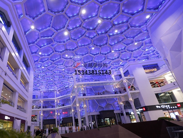 ?。?)顏色和透光性:ETFE膜材通常為無色透明狀,也可以做成白色、藍色或者其他顏色。根據(jù)需要也可以在無色透明或者其他顏色膜材上印制各種圖案。