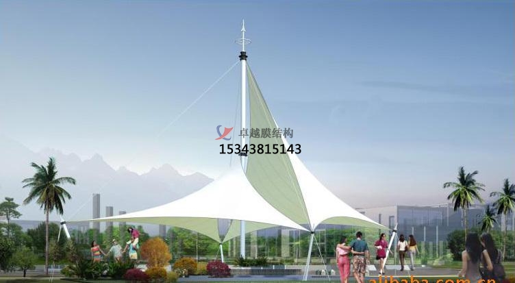 2.標志性小品 一個城市的中心區(qū)反映一個城市的地輿面貌和民族風情,一起,也是一個城市文化開展程度的標志。而景象設計要求其具有廣泛的可讀性、老少皆宜,既有超凡脫俗的藝術價值,又能使群眾膾炙人口與群眾息息相通。膜結(jié)構以其鮮明的特性和標識性,使用于城市小品設計中。