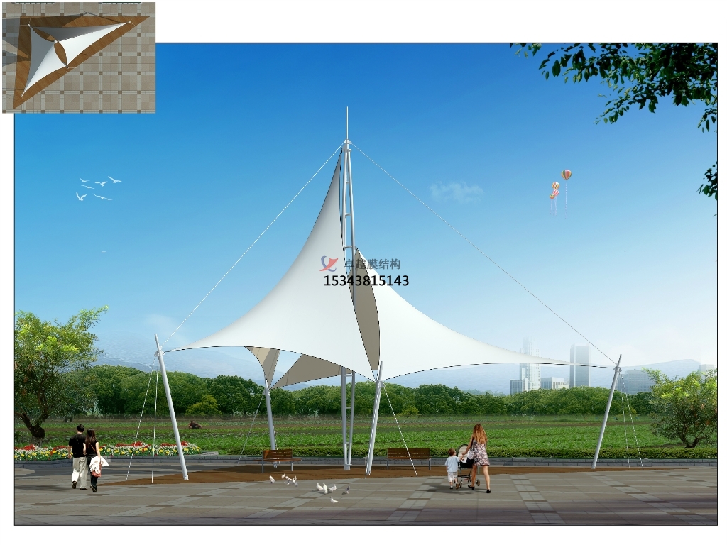6、景觀設(shè)施:膜結(jié)構(gòu)以其特殊的建筑表現(xiàn)手法,主要體現(xiàn)在造型、漫射透光性、豐富多彩,可廣泛應(yīng)用于入口、標志性小品 、步行街、停車場等,其他建筑特性無須較高要求。