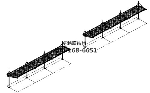膜材采用白色高端國產(chǎn)星益達(dá)高自潔環(huán)保建筑膜材,鋼結(jié)構(gòu)采用更好的標(biāo)準(zhǔn)Q235B鋼材,表面采用酚醛底漆處理,面漆采用白色鋼結(jié)構(gòu)專用快干磁漆。