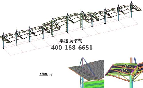 本工程膜材采用白色高端國產膜材PVDF高自潔環(huán)保建筑膜材,鋼結構采用更好的標準Q235B鋼材,表面采用酚醛底漆處理,面漆采用白色鋼結構專用快干磁漆。