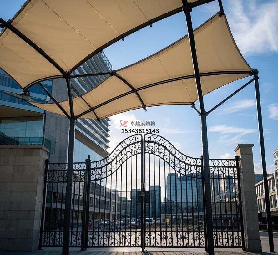 膜結(jié)構(gòu)大門還具備良好的遮陽(yáng)功能。炎炎夏日,膜材能夠?yàn)榫用駬纹鹨黄鍥龅目臻g,無(wú)論是步行進(jìn)出小區(qū)的居民,還是在門口短暫停留等待的人員,都能免受烈日的炙烤。部分膜材具有一定的透光性,在遮陽(yáng)的同時(shí),還能讓自然光適度透入,使大門內(nèi)部空間明亮舒適,避免因光線不足而產(chǎn)生的昏暗壓抑感。此外,膜結(jié)構(gòu)大門還可以根據(jù)需要設(shè)置一些附屬設(shè)施,如在大門兩側(cè)安裝宣傳欄,用于發(fā)布小區(qū)通知、活動(dòng)信息等,方便居民及時(shí)了解小區(qū)動(dòng)態(tài)。