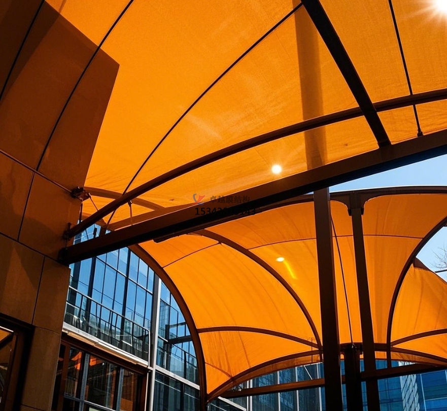 小區(qū)大門膜結(jié)構(gòu)選用的膜材具有出色的物理性能。首先,其防水性能極佳,能有效抵御各種惡劣天氣下的雨水侵襲,為進(jìn)出小區(qū)的居民遮風(fēng)擋雨,確保居民在雨天也能干爽通行。其次,膜材的抗紫外線能力很強(qiáng),能有效阻擋陽(yáng)光中的有害紫外線,延緩膜材老化,保證大門長(zhǎng)期使用后依然能保持良好的外觀和性能。這不僅延長(zhǎng)了膜結(jié)構(gòu)大門的使用壽命,降低了維護(hù)成本,還為居民提供了一個(gè)防曬的過(guò)渡空間,減少了陽(yáng)光直射對(duì)人體的傷害。