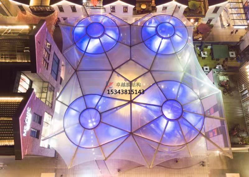 膜結構以高強度柔性薄膜(如ETFE、PVDF)為核心材料,結合鋼索、桁架等支撐體系,形成兼具輕量化與高穩(wěn)定性的空間曲面12。其自重僅為傳統(tǒng)鋼構的1/3,大幅降低基礎造價,同時支持50米以上無柱大跨度設計,為商業(yè)廣場創(chuàng)造開闊通透的公共空間。ETFE氣枕膜通過多層鍍點設計,可智能調(diào)節(jié)透光率與紫外線過濾效率,例如嘉興長安里商業(yè)街的天幕結構,既能實現(xiàn)光線漫射營造柔和氛圍,又能有效阻隔70%以上的紫外線輻射。
