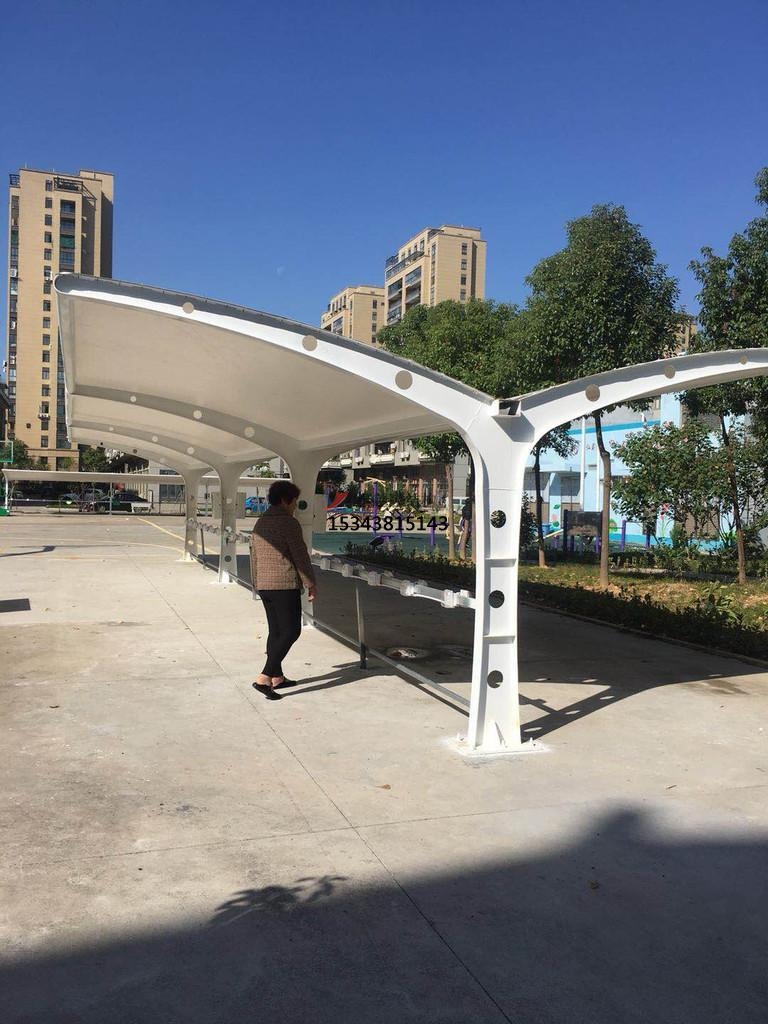 3、膜結構充電站頂部封板采用茶色(顏色可挑選)陽光板封頂,與車棚整體骨架用壓條鉚接固定,耐酸堿腐蝕,有足夠強度對棚內車輛起到保護作用。