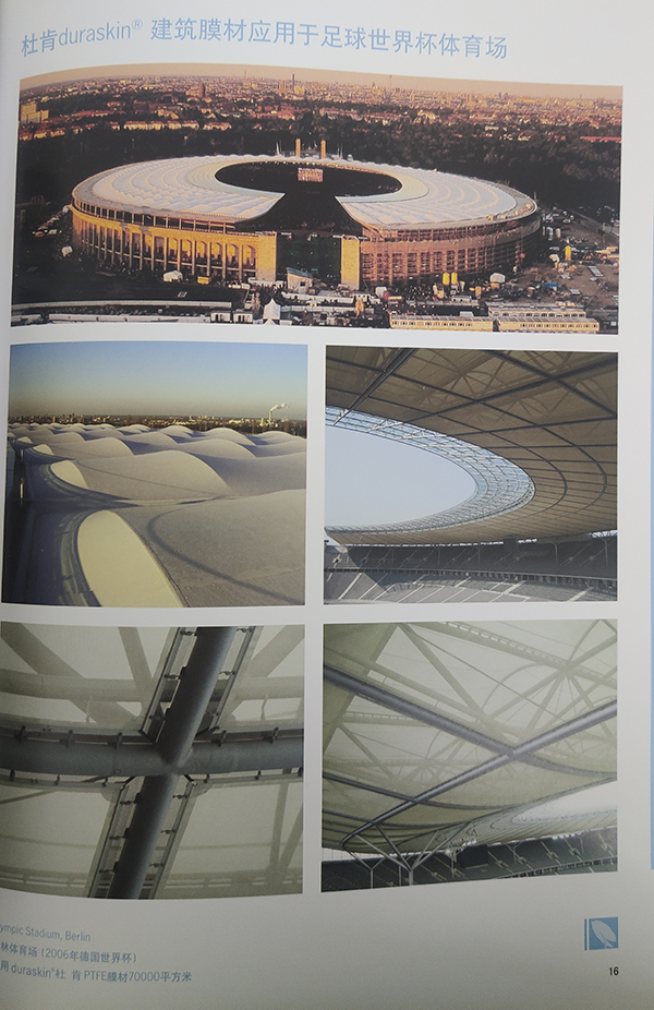 3、有眾多的成功案例:在歐洲的大型PVC項目幾乎都采用杜肯膜材:1993年斯圖加特體育場34000平方米;1994年德國Halle網(wǎng)球中心10000平方米;1995年奧地利機場停車場16000平方米;1996年土耳其安卡拉體育場16000平方米;德國科隆音樂中心25000平方米;1997年德國漢堡網(wǎng)球中心10000平方米;1998年法國圖盧茲體育場15000平方米;999年德國漢堡體育場50000平方米;2000年CARGOLIFTER車間110000平方米;2001年美國奧蘭多Dolphin賓館15000平方米等等。