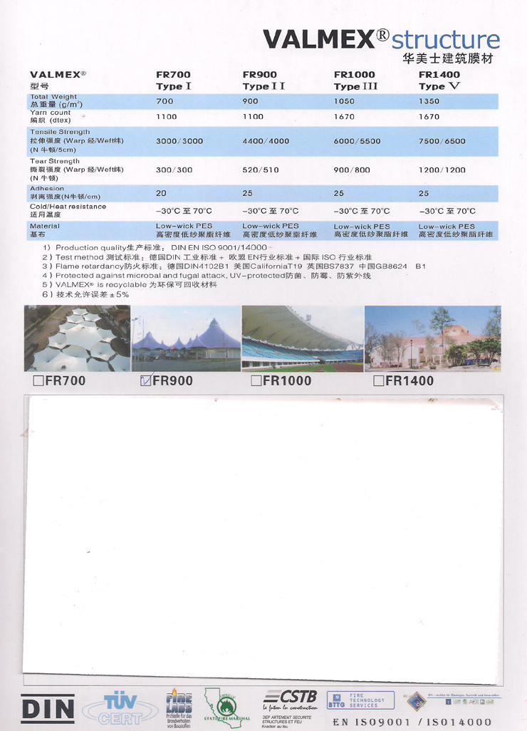 德國米樂膜材的獨(dú)特性能:雙面PVDF自潔涂層-不僅對膜材頂面有更好的的保護(hù)作用,而且對底面也有優(yōu)良的保護(hù)作用。完全消除了僅有一面PVDF涂層的膜材缺點(diǎn),和因此而帶來的工程隱患。使其更加適合品質(zhì)要求較高的大型、永久性、標(biāo)志性建筑。