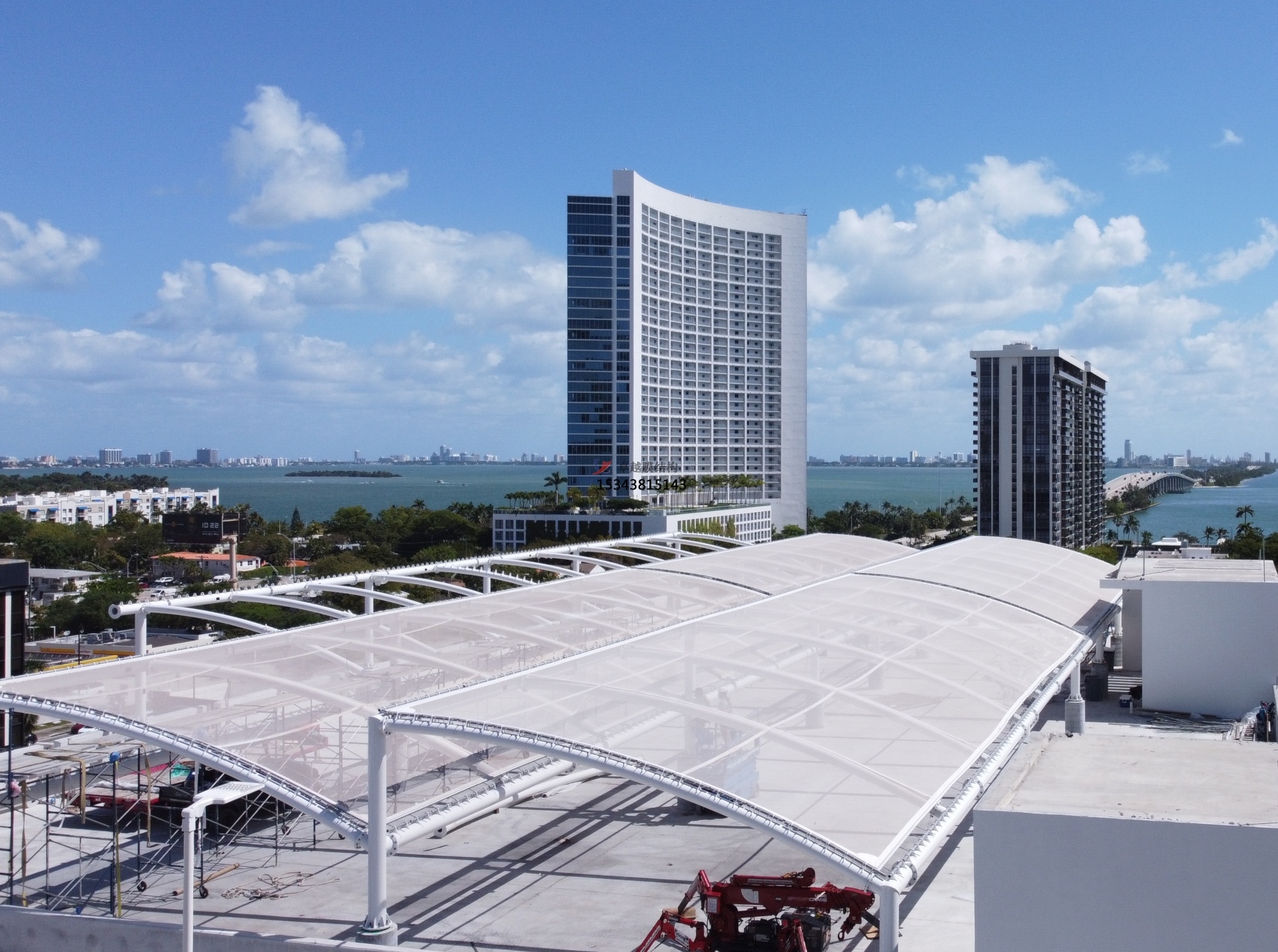 膜片下料按次序要經(jīng)三道程序: 讀取裁剪規(guī)劃的坐標, 取點; 復核坐標, 劃下料線; 復檢坐標, 落刀下料。然后貼上編號標簽, 抬到放樣區(qū)。因為索、膜結構工程通常均為空間曲面, 裁剪即是用平面膜材表示空間曲面。這種用平面膜材擬合空間曲面的辦法必定存在差錯, 所以裁剪人員在膜材裁剪加工進程中參加一些補救措施是適當必要的。對已裁剪的膜片要別離進行尺度復測和編號, 并具體紀錄實測偏差值。裁剪工作進程中應盡量防止膜體折疊和曲折, 避免膜體發(fā)生曲折和折疊損害而使膜面褶皺, 影響修建漂亮。