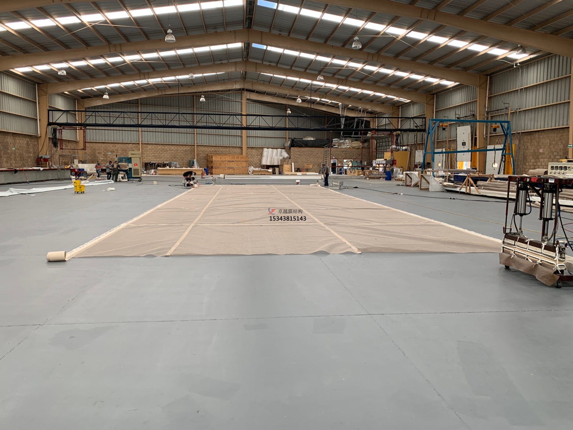 膜結構工程的加工制造膜材的首要加工流程包含: 進料-查驗膜材-膜片下料-編號-膜片編排放樣-膜片初粘-駁接-包裝。因為膜材的裁剪、包裝進程都較為復雜, 各種角度改變較多, 且加工精度請求非常高, 所以在制造進程中要加強質(zhì)量管理, 保證制造精度。