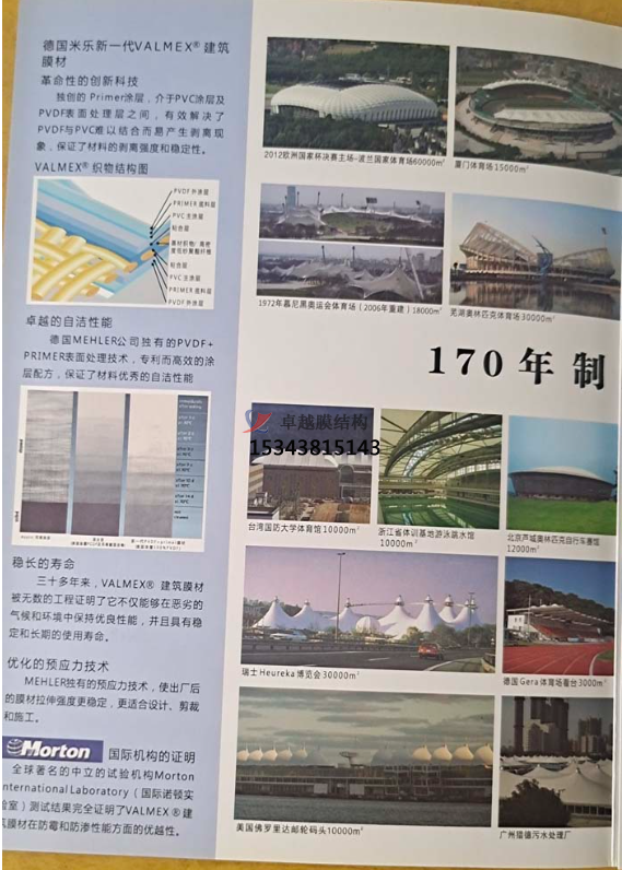 德國MEHLERHAKU米樂公司擁有165年(1837年一2003年)的制造業(yè)經驗。通過1S09001質量體系認證,所有產品均經過嚴格的DIN德國工業(yè)標準,以及各個國家的膜材工業(yè)標準。2002年,德國米樂公司獲聘為中華人民共和國建設部《索膜建筑結構制品》行業(yè)標準編制委員成員。德國米樂的產品系列涵蓋環(huán)保等各種PVC膜材領域,包括:建筑工程、輕型結構、廣告、遮陽、汽艇、軍用、裝飾、水利環(huán)保,等等。