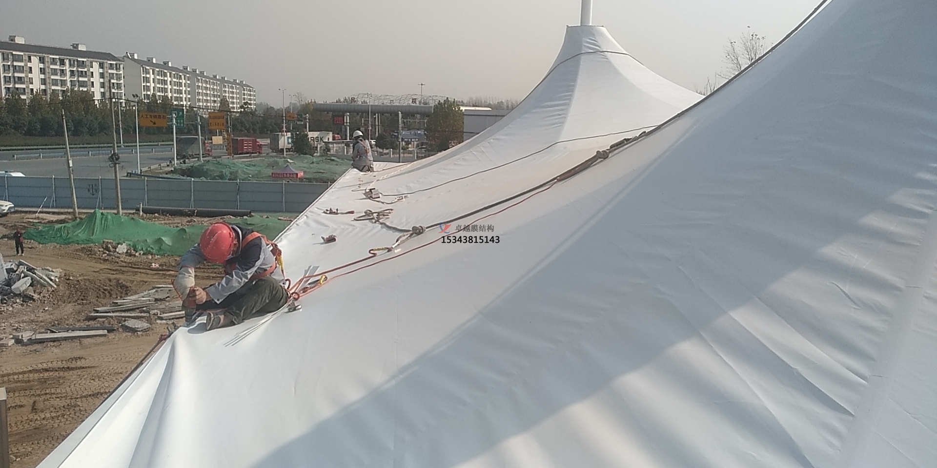 4、清理現(xiàn)場,在地面鋪墊保護(hù)材料;向工人講解工序及分工;展開膜面,進(jìn)行如在膜面打孔、穿鋼索、安裝膜角節(jié)點(diǎn)板或膜夾板等準(zhǔn)備工作;在支承結(jié)構(gòu)上綁扎繩網(wǎng)以臨時(shí)支承展開的膜面。