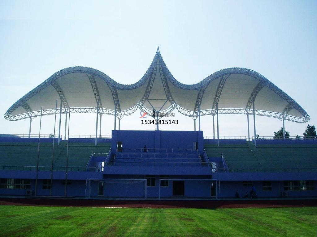 膜結(jié)構(gòu)看臺(tái)在體育設(shè)施上主要應(yīng)用在學(xué)校操場(chǎng)運(yùn)動(dòng)看臺(tái)或主席臺(tái)屋頂,另外大型體育場(chǎng)館看臺(tái)膜結(jié)構(gòu)屋頂也屢見(jiàn)不鮮。看臺(tái)造型般由貝殼形峰膜及部張拉膜組成,形式新穎活潑。膜結(jié)構(gòu)看臺(tái)將鋼架、索、膜巧妙結(jié)合,通過(guò)薄膜、膜邊索、脊索、谷索、拉索、拉桿及定的格構(gòu)梁來(lái)穩(wěn)定。膜頂平滑過(guò)渡,結(jié)構(gòu)美觀、輕巧、整體造型相互輝映,別具格。