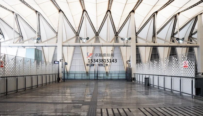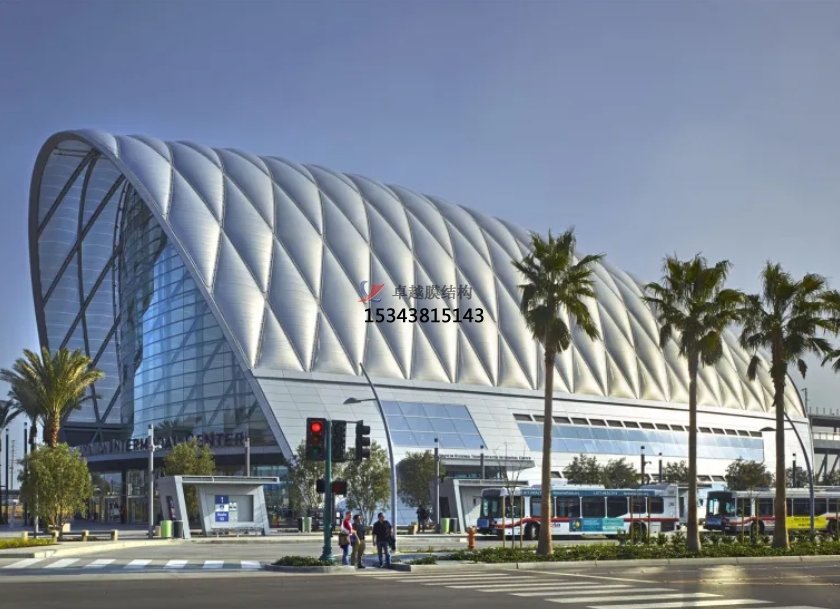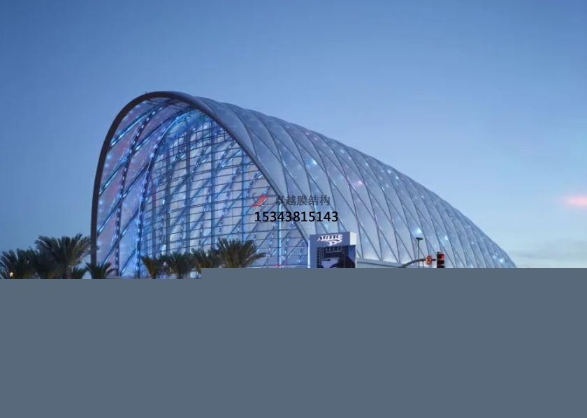 膜結(jié)構(gòu)使得建筑輕盈感十足,膜材料的良好透性使得建筑界面透光而不透視。由于該材料(ETFE)氣枕在陽(yáng)光底下富有通透感光線可以通過(guò)漫射和折射進(jìn)入界面,讓膜結(jié)構(gòu)建筑呈現(xiàn)出朦朧夢(mèng)幻之美。
