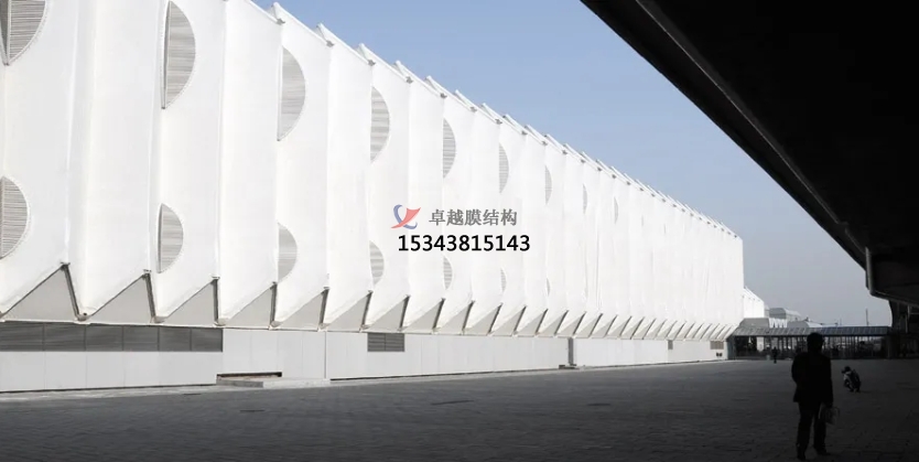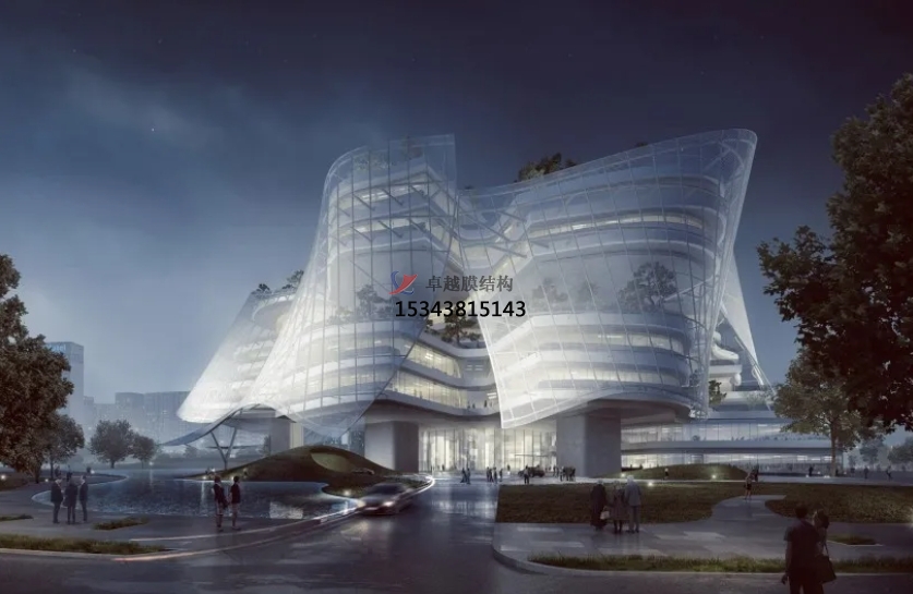 該建筑的采用 PTFE 膜材使得設(shè)計(jì)中心是一座適合當(dāng)?shù)貧夂虻母咝芫G色建筑。特制的半透明遮陽(yáng)膜,設(shè)計(jì)透光率為40%,既降低了建筑的太陽(yáng)輻射,又給辦公空間提供了充分柔和的自然光。