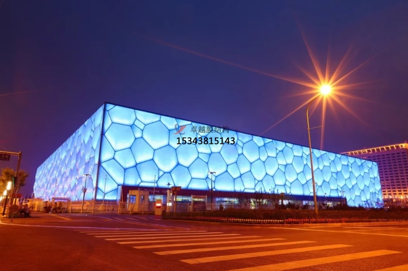 基于“泡沫”的設(shè)計(jì)靈感,設(shè)計(jì)師為“方盒子”包裹上了一層建筑外皮,上面布滿了酷似水分子結(jié)構(gòu)的幾何形狀;通過(guò)覆蓋的ETFE 透明膜賦予了建筑冰晶狀的外貌,使其具有獨(dú)特的視覺(jué)效果和感受,輪廓和外觀因此變得柔和,水的神韻在建筑中得到了完美的體現(xiàn)。