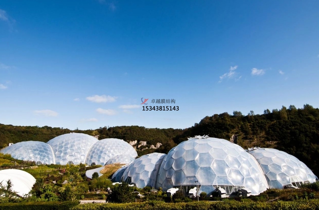 分為氣承式(整體氣壓支撐)與氣脹式(局部氣囊支撐)兩類。如某海灘餐廳項目采用32個橢圓形氣枕構(gòu)成1655㎡屋面,通過氣壓差維持結(jié)構(gòu)張力,配合六邊形印花實現(xiàn)動態(tài)遮陽。
