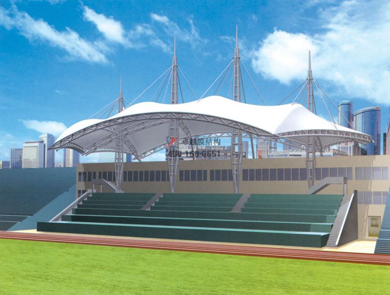 膜結(jié)構(gòu)看臺在體育設(shè)施上主要應(yīng)用在學(xué)校操場運(yùn)動看臺或主席臺屋頂,另外大型體育場館看臺膜結(jié)構(gòu)屋頂也屢見不鮮??磁_造型般由貝殼形峰膜及部張拉膜組成,形式新穎活潑。膜結(jié)構(gòu)看臺將鋼架、索、膜巧妙結(jié)合,通過薄膜、膜邊索、脊索、谷索、拉索、拉桿及定的格構(gòu)梁來穩(wěn)定。膜頂平滑過渡,結(jié)構(gòu)美觀、輕巧、整體造型相互輝映,別具格,接下來我們起來看看膜結(jié)構(gòu)看臺的設(shè)計是怎么樣的。