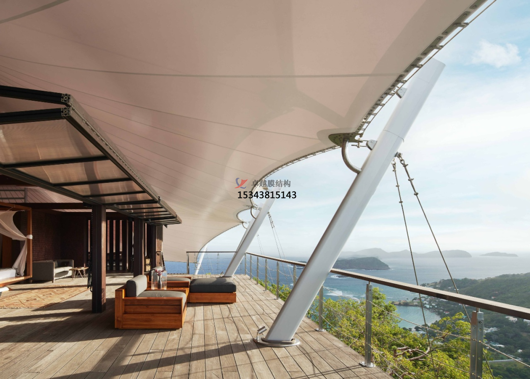 1.張拉膜結(jié)構(gòu):以膜材、鋼索及支柱構(gòu)成,利用鋼索與支柱在膜材中導(dǎo)入張力以達安定的形式,是最能展現(xiàn)膜結(jié)構(gòu)精神的構(gòu)造形式。