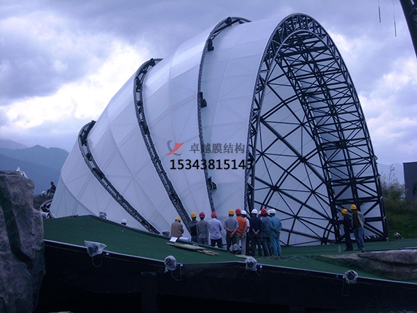 膜結(jié)構(gòu)在設(shè)計(jì)與施工方面有諸多要點(diǎn)。首先是設(shè)計(jì)關(guān)鍵環(huán)節(jié),其中包含力學(xué)分析,通過(guò)有限元軟件(如ANSYS)計(jì)算膜面張力分布,確保荷載下不產(chǎn)生褶皺或撕裂;找形設(shè)計(jì),根據(jù)建筑造型需求,確定膜面初始形態(tài)(如馬鞍形、雙曲面),需兼顧受力合理性;剪裁設(shè)計(jì)是將三維膜面展開為二維裁剪片,考慮材料熱脹冷縮及張拉后的變形量(誤差需控制在1%以內(nèi))。然后是施工流程方面,其中包含基礎(chǔ)與支架安裝,也就是澆筑混凝土基礎(chǔ),安裝鋼結(jié)構(gòu)骨架或索網(wǎng);膜材的加工,其是在工廠按裁剪圖焊接膜片(熱熔焊接或高頻焊接),進(jìn)行水密性測(cè)試;現(xiàn)場(chǎng)張拉是將膜材吊裝到位,通過(guò)鋼索或千斤頂逐步張拉至設(shè)計(jì)預(yù)應(yīng)力值;細(xì)節(jié)處理是密封邊緣接縫,安裝排水槽、檢修通道等附屬設(shè)施。最后必須要兼顧的是安全與技術(shù)難點(diǎn),需考慮風(fēng)荷載下的膜面振動(dòng)(如設(shè)置減震裝置),還有防火要求,膜材需達(dá)到B1級(jí)以上防火標(biāo)準(zhǔn)(如PTFE膜材為不燃材料)。