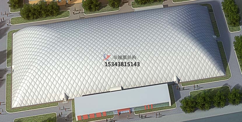 6、我司根據(jù)環(huán)境及應用場合的不同,把選好的“面料”(膜材)按尺寸裁剪,設計出各種獨特的建筑款式,再與“輔料”(加強構件,如鋼架、鋼柱或鋼索)結合通過一定方式使其內部產生一定的預張應力以形成某種空間。