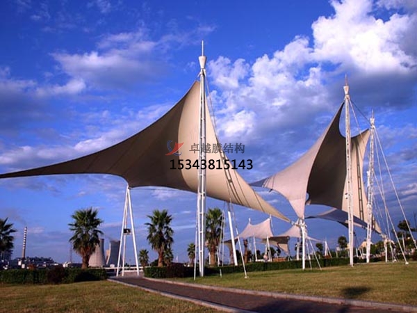 膜結(jié)構(gòu)具有較好的隔熱效果,對太陽熱能可反射掉70%,膜材本身吸收了17%,傳熱13%,而透光率卻在20%以上,經(jīng)過10年的太陽光直接照射,其輝度仍能保留70%。這與它本身的材質(zhì)有關(guān)系。膜結(jié)構(gòu)跨度空間大指出其因為自重輕,膜結(jié)構(gòu)修建能夠不需要內(nèi)部支撐面大跨度掩蓋空間,這使大家能夠列靈活計和運用修建空間,描繪出愈加有構(gòu)思的修建。所以一般膜結(jié)構(gòu)建筑總能有著讓人賞心悅目的外觀設計,加上自身的實用經(jīng)濟性讓膜結(jié)構(gòu)得到了更多建筑的青睞之選。