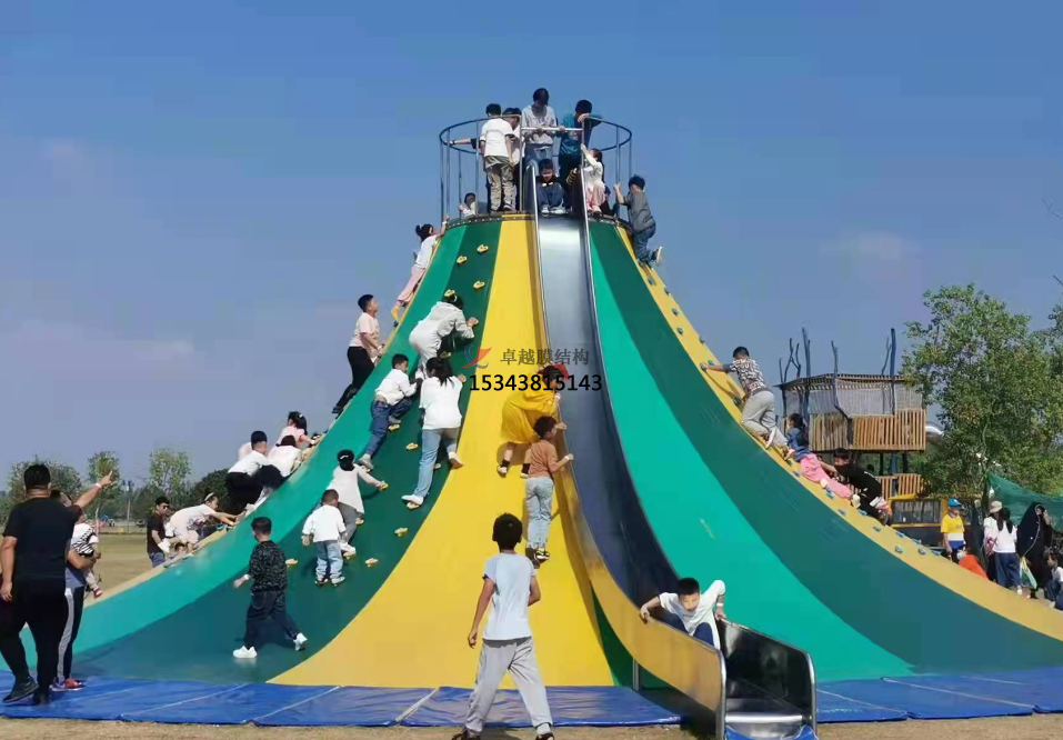 火山攀巖---它可以塑造出火山的外形,使整個游樂設備的外觀看起來像火山,從而得名火山攀巖。這種膜結構能夠很好地貼合設計需求,通過一定的設計和加工工藝,將膜材覆蓋在支撐結構上,構建出火山形狀的外觀,為游樂場所增添獨特的景觀元素。