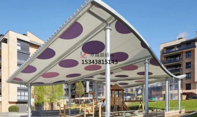 兒童游樂場所本就是趣致可愛的,迎合孩子們的喜好,配套遮陽設施的建設也應該考慮在內,下面兩個遮陽項目屬于同一系列,波點圖案,活潑的色調,再加上起伏的造型,讓人感覺輕松愉快。兩個項目都采用PVC+ETFE膜材。
