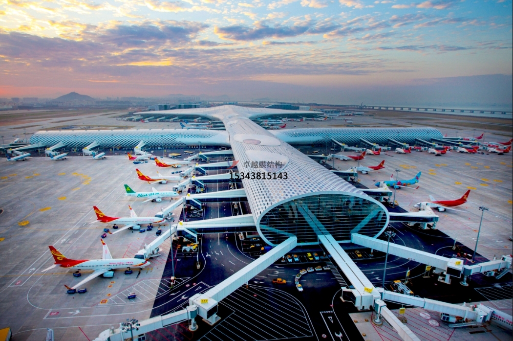 深圳寶安國(guó)際機(jī)場(chǎng)和北京大興國(guó)際機(jī)場(chǎng),也使用不同形式的膜結(jié)構(gòu),分別是ETFE膜、PTFE和玻璃膜材料。其中機(jī)場(chǎng)航站樓的落地幕墻使用了PTFE膜材料,起到隔音、防紫外線的作用,同時(shí)讓建筑變得更加美觀。