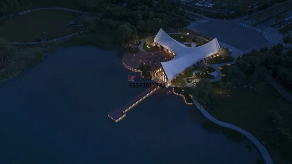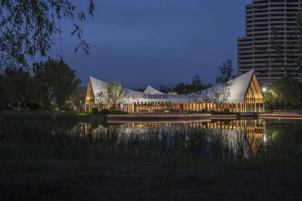 設(shè)計(jì)采用了新型鋼木組合結(jié)構(gòu),工廠預(yù)制,建造便捷,縮短工期。屋頂使用的是白色PVDF膜材,通過張拉性能實(shí)現(xiàn)三維屋面造型,勾勒出流暢的屋脊線,強(qiáng)化建筑簡(jiǎn)潔、干凈的形體美感。