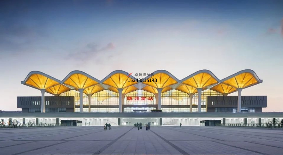 隨州高鐵站:隨州高鐵站站房采用了膜結(jié)構(gòu)設(shè)計(jì),通過驗(yàn)算不同膜材的最大適用跨度,最終選用了滿足要求的膜材方案。該站房膜結(jié)構(gòu)造型獨(dú)特,既美觀又實(shí)用,成為隨州市的新地標(biāo)。