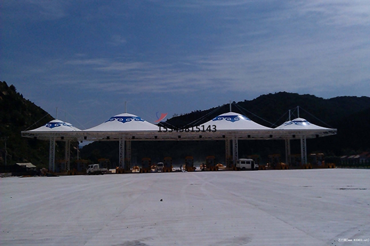膜結構收費站由立柱和頂棚構成。立柱多由金屬合金制作,如鋼,鋁等,質量輕且質地硬,頂棚則是由膜結構材料制成。