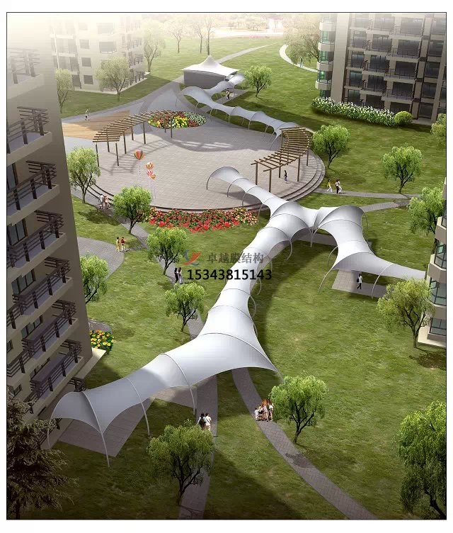 近年來,在人口密集的大城市,在居住區(qū)周邊配置綠色空間并有人行步道。居民可以在不受車輛的影響下,在居住區(qū)附近的街心地帶輕松愉快地散步、休憩,而感到十分愜意。在綠色空間中構(gòu)造一座膜小品,即生動(dòng)的美化了環(huán)境——如同廣闊綠洲中的點(diǎn)點(diǎn)白帆,又有很強(qiáng)的功能性——人們可以在行走之暇小憩一會(huì)兒。