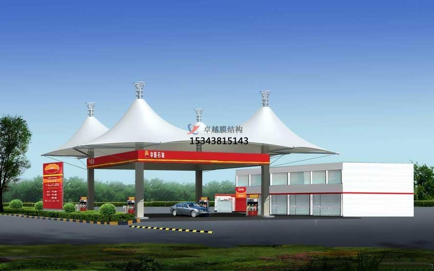 膜結(jié)構(gòu)加油站的柔性使其在任一荷載作用下均以有利的形狀承載。當(dāng)然,結(jié)構(gòu)的安置和形狀要根據(jù)荷載狀況來進(jìn)行規(guī)劃和調(diào)整。規(guī)劃要確何膜面與其輔助結(jié)構(gòu)和諧工作,以防止力在膜面或輔助結(jié)構(gòu)上會(huì)集而達(dá)結(jié)構(gòu)破壞的臨界值。