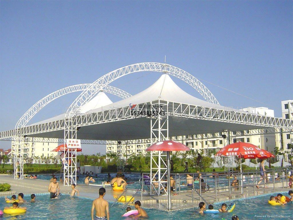 以鋼結構或是集成材構成的屋頂骨架后,在其上方張拉膜材的構造形式,下部支撐結構安定性高,因屋頂造型比較單純,開口部不易受限制,且經濟效益高等特點,廣泛適用于任何大小規(guī)模的空間。
