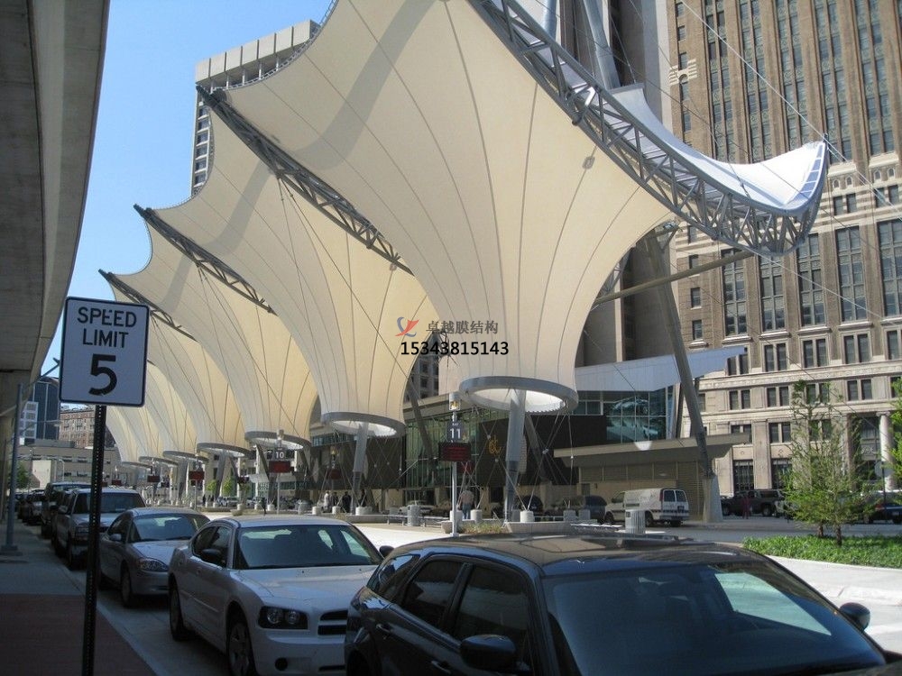 膜結(jié)構(gòu)車棚主要有很多進口的原料,它的支架也使用了高超的制作工藝。很好的先是它的耐用性,它的材料是那種高強度的張拉膜,是一種可以使用40多年的材料,如果遇到狂風暴雨也不會有很大的破壞;還有它的藝術(shù)性,它的造型師非常美觀的,尤其是它的曲線美;經(jīng)濟性,把車放在里面,可以減緩損壞的速度,增加車輛的使用壽命;透光性也是非常好的,也可以阻擋紫外線的輻射;重量也是非常輕的,在發(fā)生坍塌或者危險的時候,可以保護棚下面的人或者物品的安全。