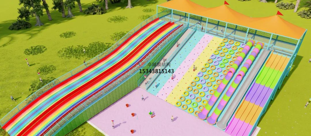 在張拉膜頂下方安裝彩虹滑道,滑道長度可根據(jù)客戶要求定制,一般可達(dá)120米?;啦捎梅阑⒛湍サ牟牧?,保證游客的安全。