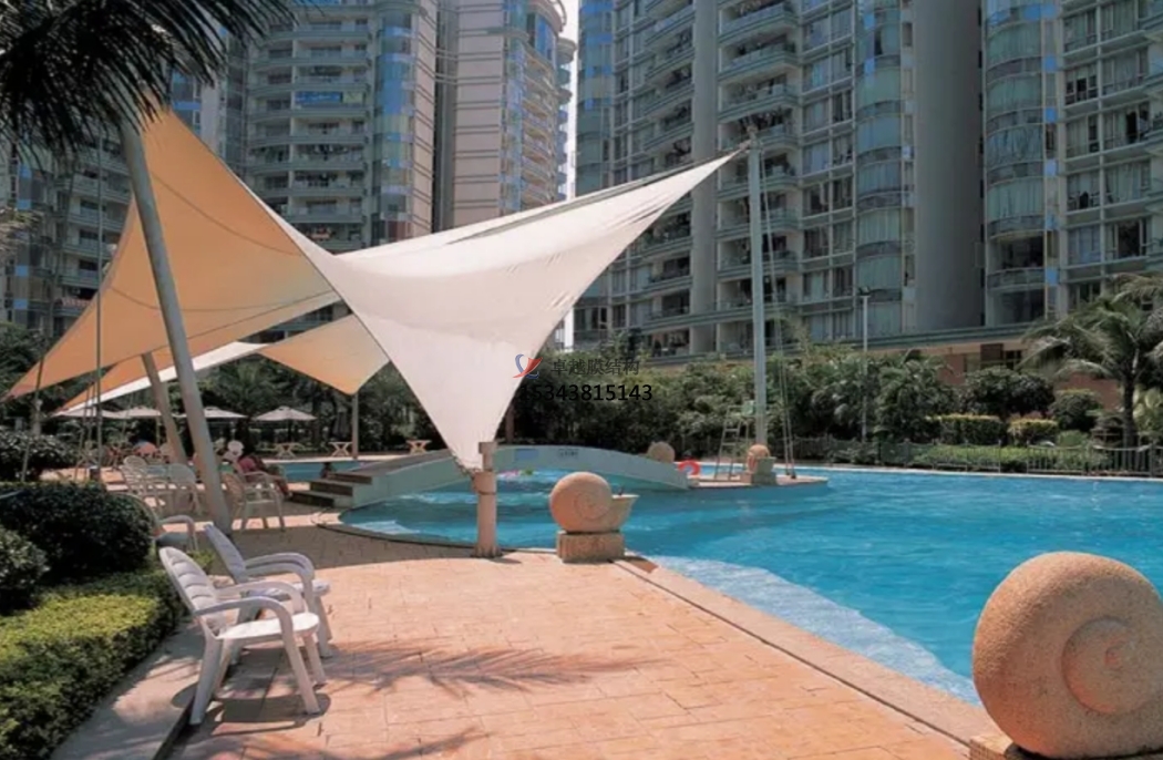 膜結(jié)構(gòu)遮陽(yáng)棚所采用的膜材料,具有自重輕、透光性好、隔熱性能強(qiáng)、耐腐蝕、防水、耐菌、耐高溫、抗紫外線、老化慢等優(yōu)點(diǎn)。這種材料不僅能夠提供有效的遮陽(yáng)效果,還能有效隔絕紫外線,保護(hù)游泳者的皮膚。同時(shí),膜材料具有良好的自潔能力,不易沾染灰塵,依靠雨水沖洗就能保持潔凈,大大降低了后期維護(hù)成本。