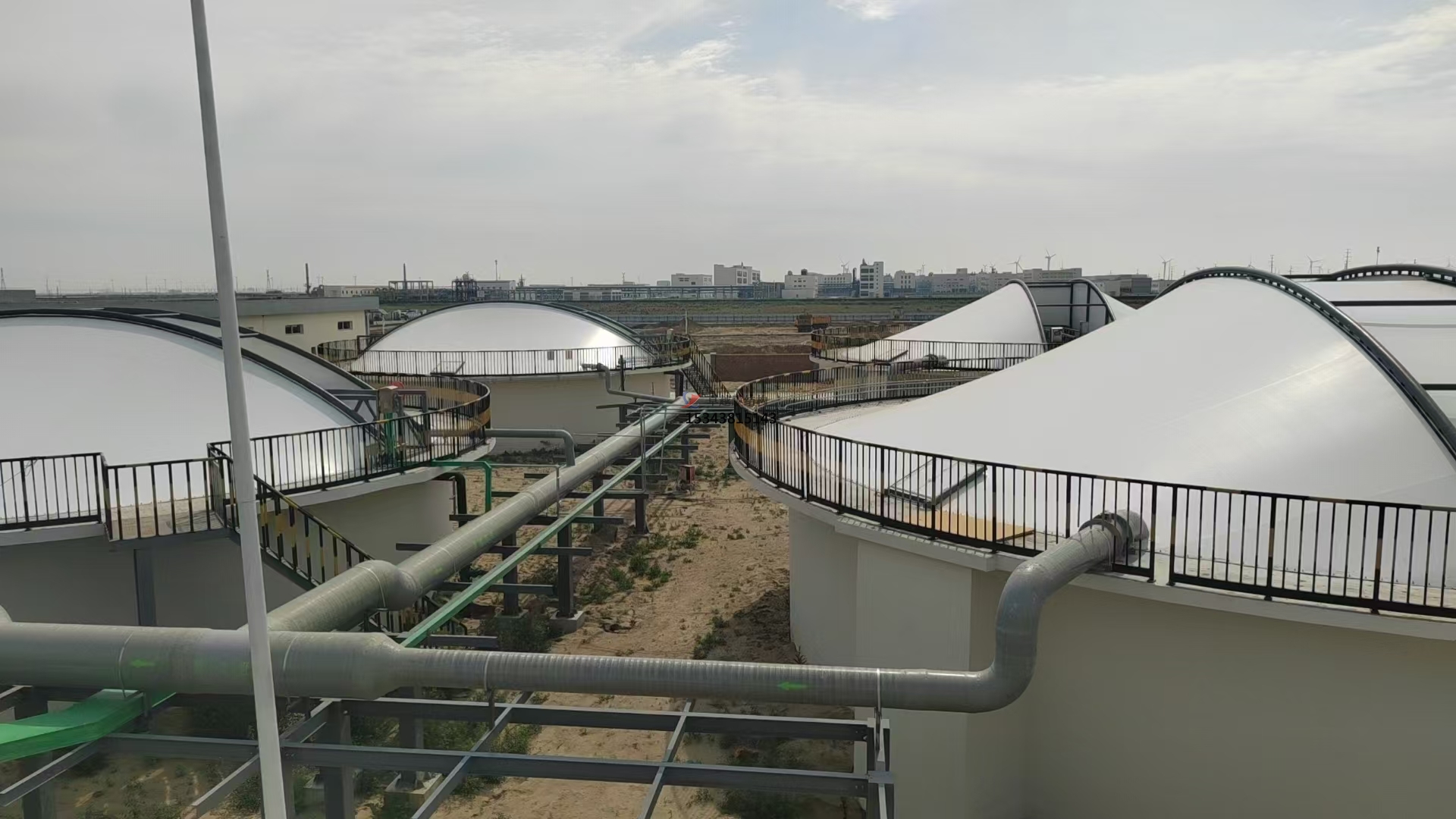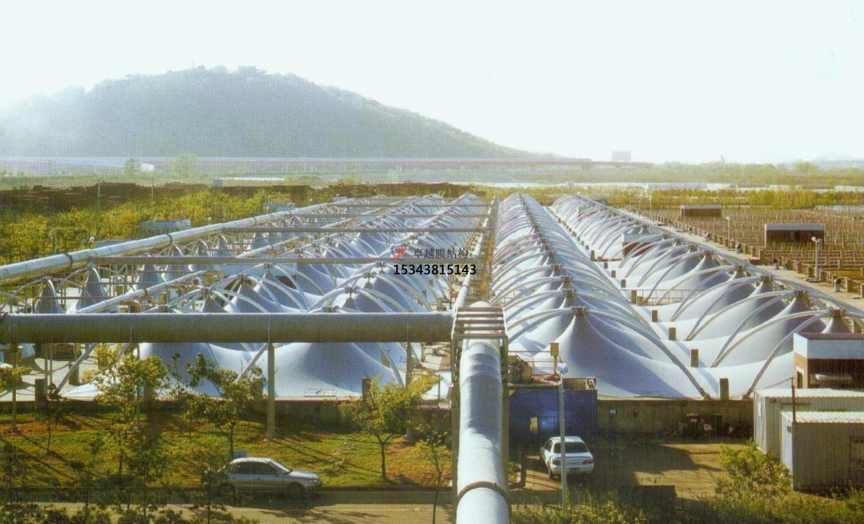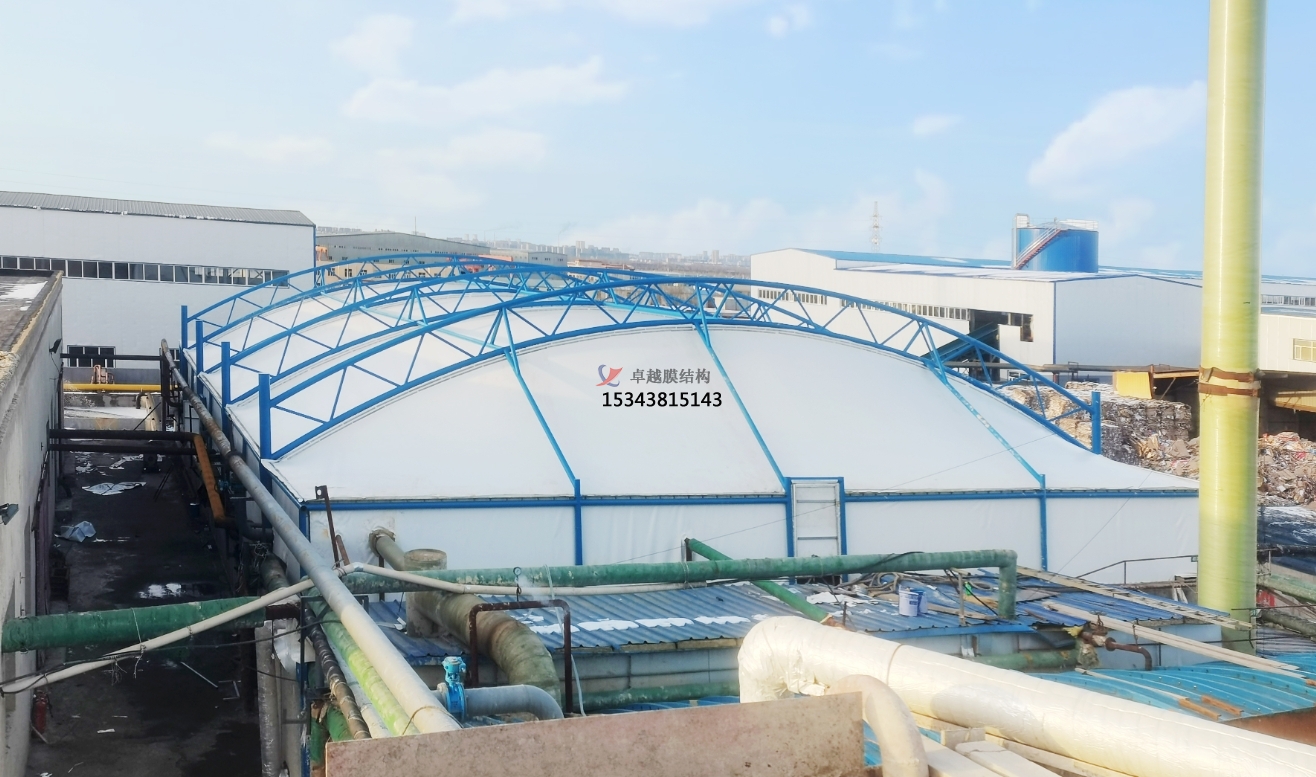 污水池反吊膜,顧名思義,是一種將薄膜材料以反吊的方式覆蓋在污水池上方的結(jié)構(gòu)。這種結(jié)構(gòu)通過鋼架或索網(wǎng)等支撐體系,將膜材料緊繃并固定于污水池上方,形成一個(gè)密閉或半密閉的空間,有效隔絕污水池內(nèi)的惡臭氣體和有害物質(zhì),防止其對外擴(kuò)散,同時(shí)保護(hù)膜材料免受污水池內(nèi)腐蝕性氣體的侵蝕。