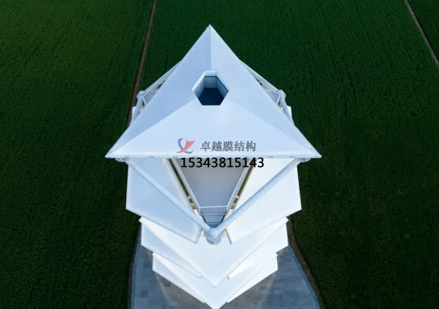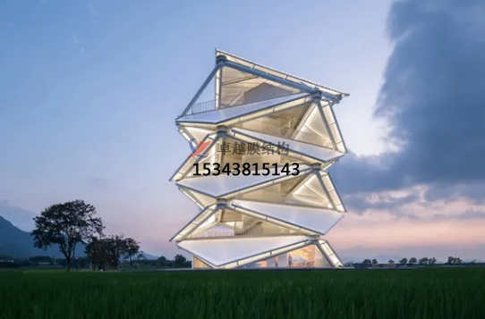 建筑的表面為白色的高強度薄膜結構,每層交錯布置,在登塔的漫游路徑中通過框景的變化展現(xiàn)出移步異景的視覺感受。項目面向所有人開放,乘坐輪椅的訪客也可以通過底層中心的核心筒電梯直達頂層。從頂層的觀景臺,人們可以獲得360度的視野,視線可以延伸到遠處的村莊和城市。