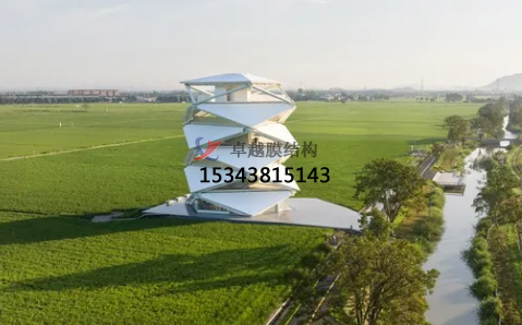 稻田上的燈塔的落成為當?shù)氐泥l(xiāng)村提供了新的觀景點和社交聚集地。瞭望塔塔高23m,坐落于國家級現(xiàn)代農業(yè)先行示范區(qū)高標準農田的中心區(qū)域。它如同雕塑一般從稻田中螺旋升起,三角形元素和白色PTFE薄膜定義了其簡潔的設計語言,在鄉(xiāng)村大地上賦予了其強烈的存在感。