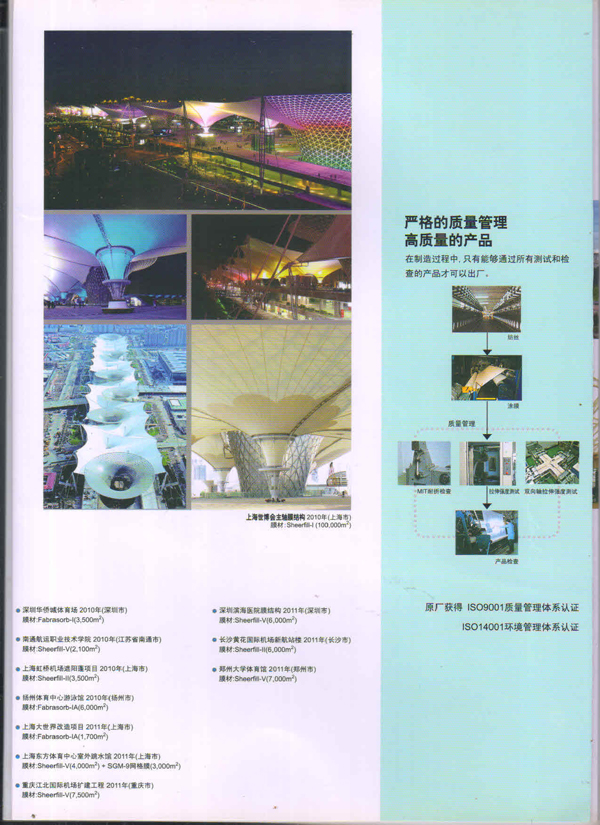 SHEERFILL產(chǎn)品能夠在-70C到+230C的溫度范團(tuán)內(nèi)安全使用。具有良好的耐熱性、耐濕性、耐藥品性等特性,即使在承受了暴風(fēng)雪這類惡劣天氣后,膜結(jié)構(gòu)仍然能維持初始狀態(tài),膜材料不會產(chǎn)生松弛。